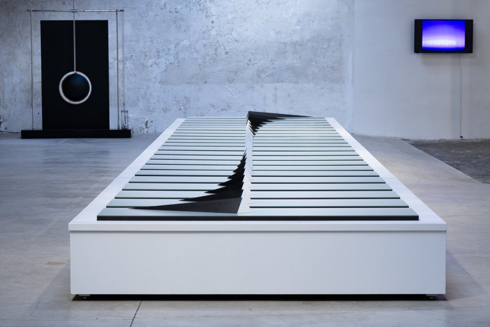 Edelstahl, weiß / schwarz lackiert, Inkjet auf Photopapier, Glas mattiert, MDF, schwarz, Podest MDF weiß lackiert