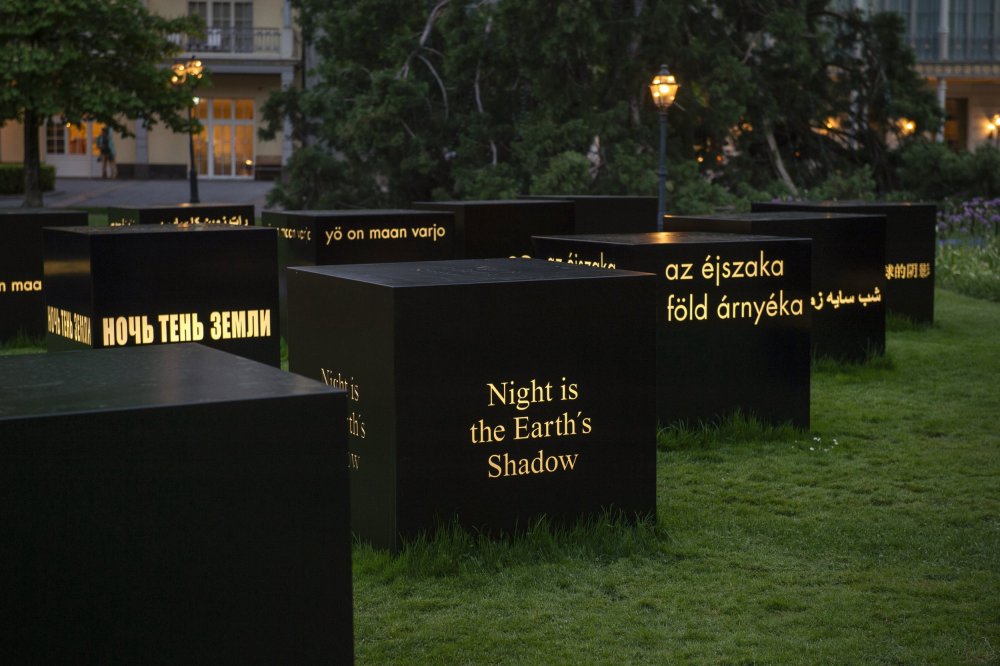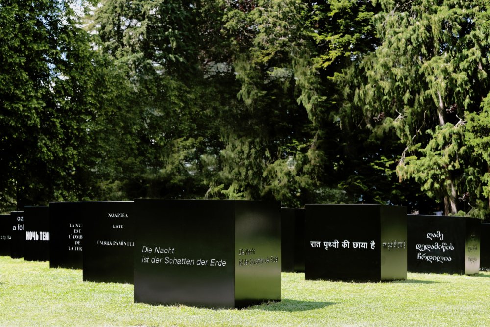Die Nacht ist der Schatten der Erde, Installation mit 25 Textkuben, Bad Ragaz, 1995/2021